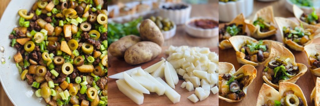 These taco cups are loaded with cheesy goodness, seasoned beef, green onions, and potatoes plus we are maximizing our flavor by adding California Ripe Olives which add a delicious silky and buttery flavor. The crispy potatoes and ground beef are seasoned with homemade taco seasoning and combined with a blend of cheeses that holds everything together as they make their way to their individual flour tortilla cups. These little taco cups are crispy, with a cheesy center and are topped with fresh sour cream, lemon kissed cilantro and tomato. They are quick and ready to be enjoyed and savored in no time! Sounds delicious, right? Let me show you how to make them.