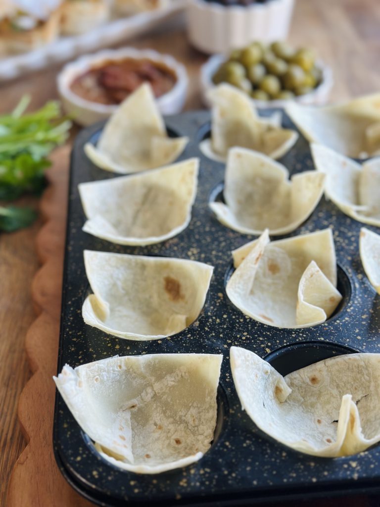 - Begin by cutting the flour tortillas into 4 even cross sections. You will be left with 12 triangles that will be the base for the taco shells. Place each piece onto a non-stick cupcake pan (or spray) Gently push the center of each tortilla to mold to the pan.