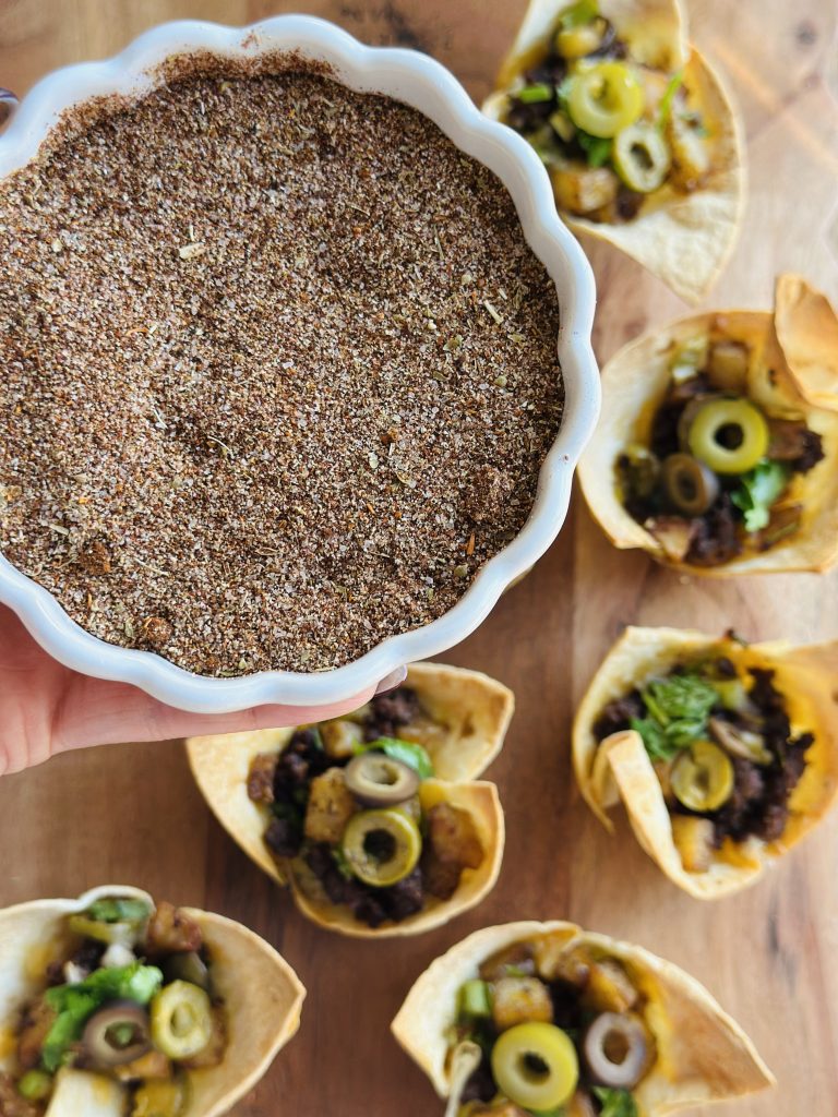 You most likely have some of the ingredients needed for this homemade taco seasoning. In a bowl combine all of the above spices (measurements in recipe below) This will make more than you need for this recipe, which is great so you have a little extra to play with in other meals. Store in an airtight container to keep it fresh and ready to use and flavor up meals!