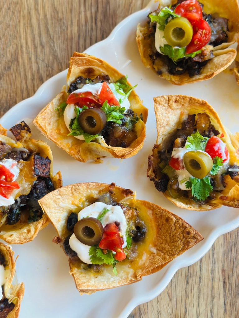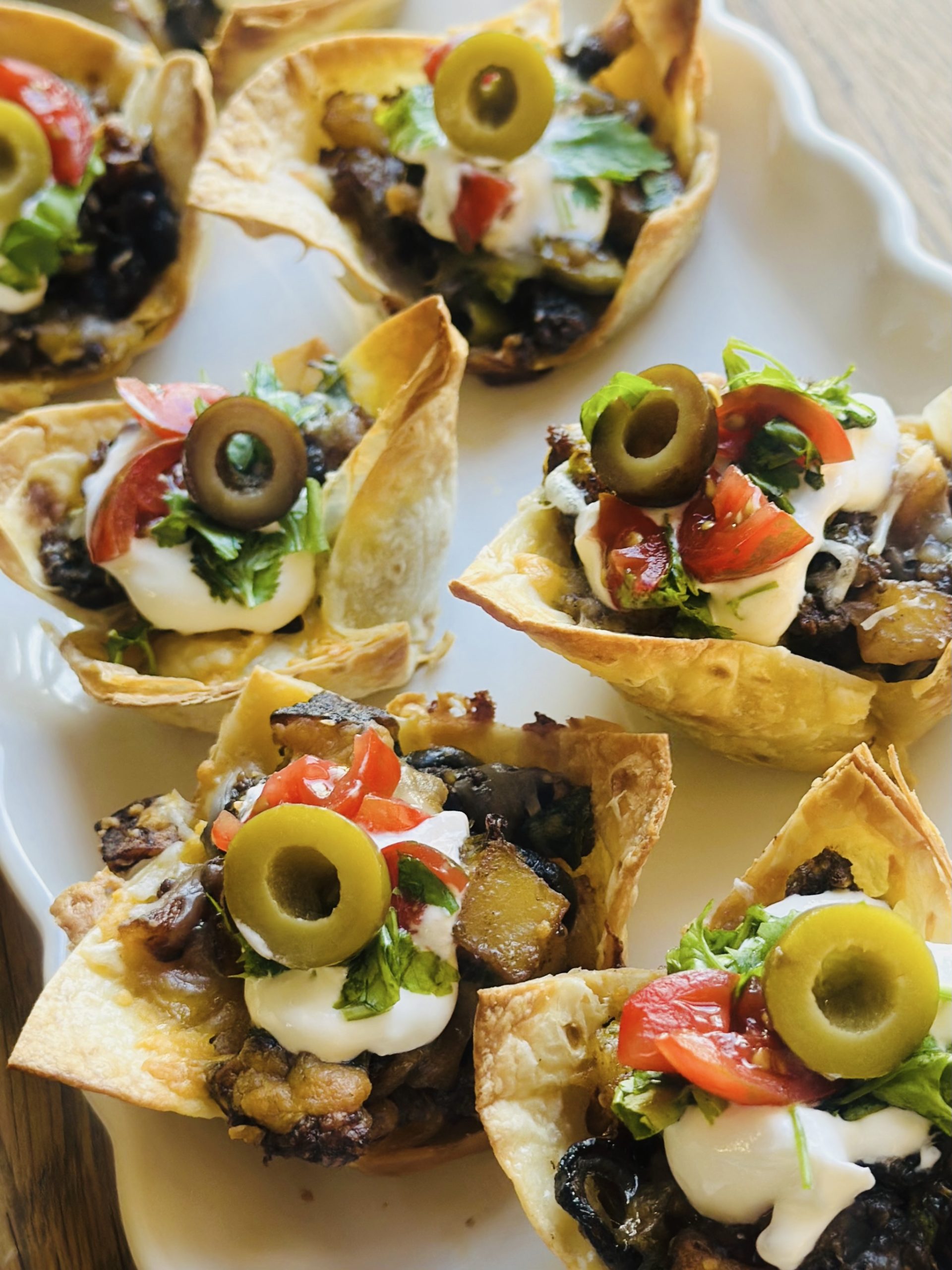 Cheesy potato and olive taco cups are a delicious twist on regular tacos! Everything there is to love about tacos, tucked in a crispy baked bite that is compact and loaded with comforting flavor. They are perfect for gameday or the holidays which are around the corner. These make a great appetizer that is fun, transports easily and can be customized to your favorite flavor combos.