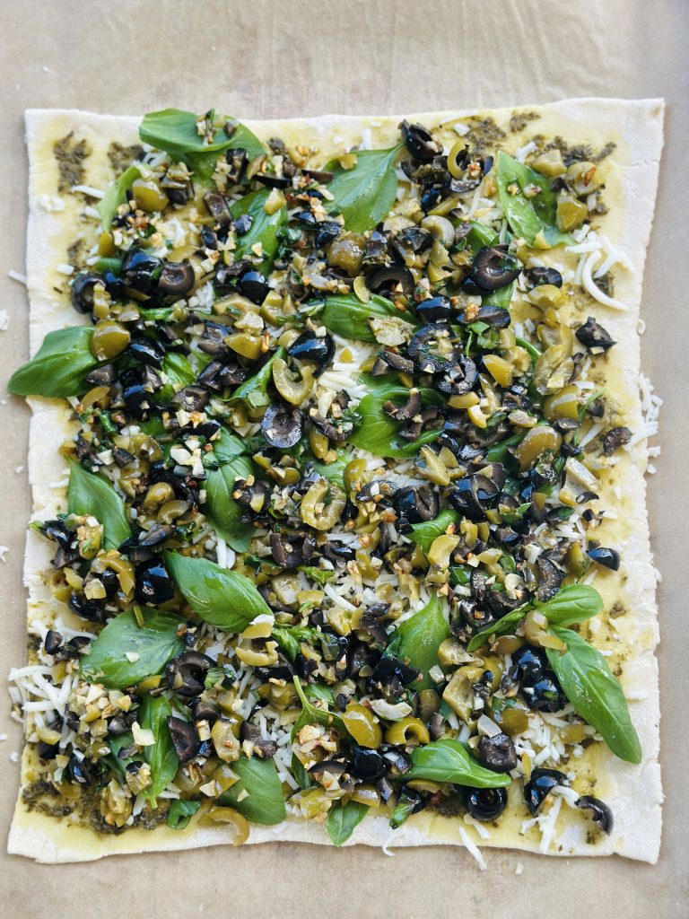 -You will want to roll out the thawed puff pastry just a bit on a floured surface, once you have both pieces rolled out just a bit begin adding the layers of pesto, basil leaves, cheese and olive mixture. Press the two pieces together gently to help it grip together.