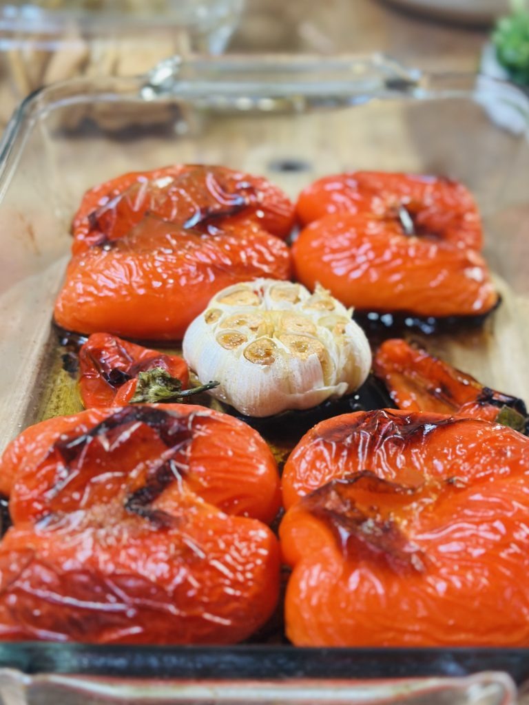 - In an oven safe dish, drizzle 1 tbsp olive oil over the garlic and the bell peppers place in oven for 30-35 min at 425 °F until the tops begin to char.